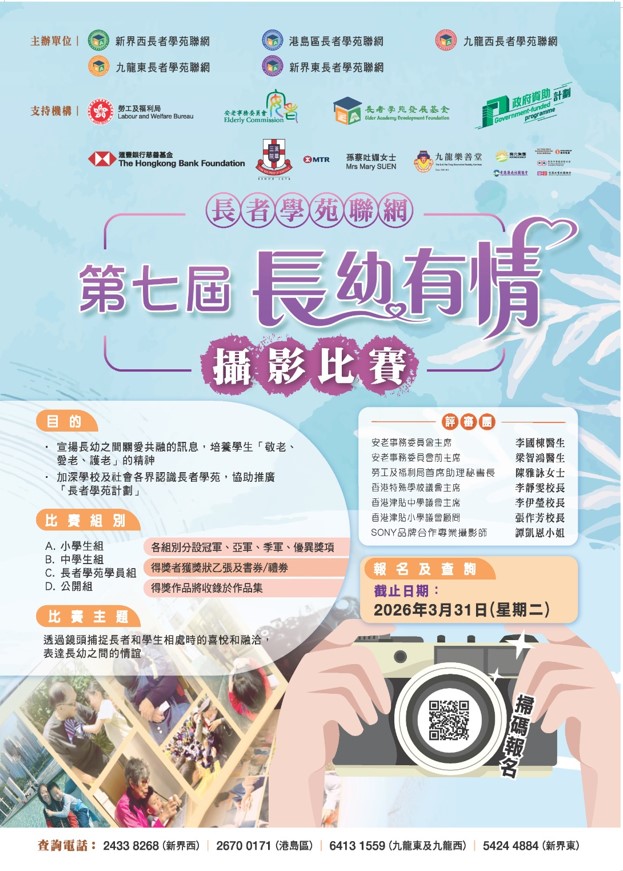 五區長者學苑聯網舉辦第七屆「長幼有情」攝影比賽,邀請全港中、小學生、長者學苑學員及公眾人士參賽,透過鏡頭捕捉長者和學生相處時的喜悅和融洽,宣揚長幼之間關愛共融的訊息,培養學生「敬老、愛老、護老」的精神,並加深學校及社會各界認識長者學苑計劃。